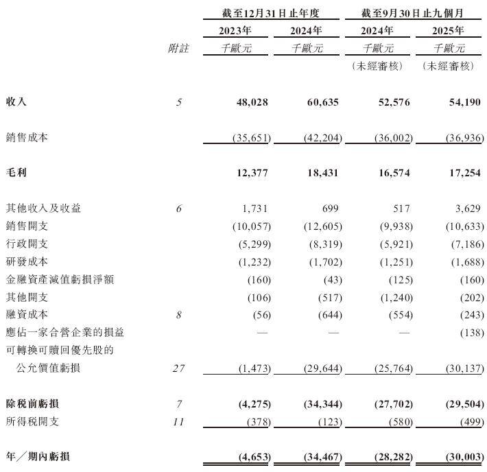 盈利能力上,2023年、2024年及2025年前九个月,净亏损分别为465.3万、3446.7万和3000.3万欧元,经调整净利润则从亏损逐步转正,2025年前三季度达到124.4万欧元。