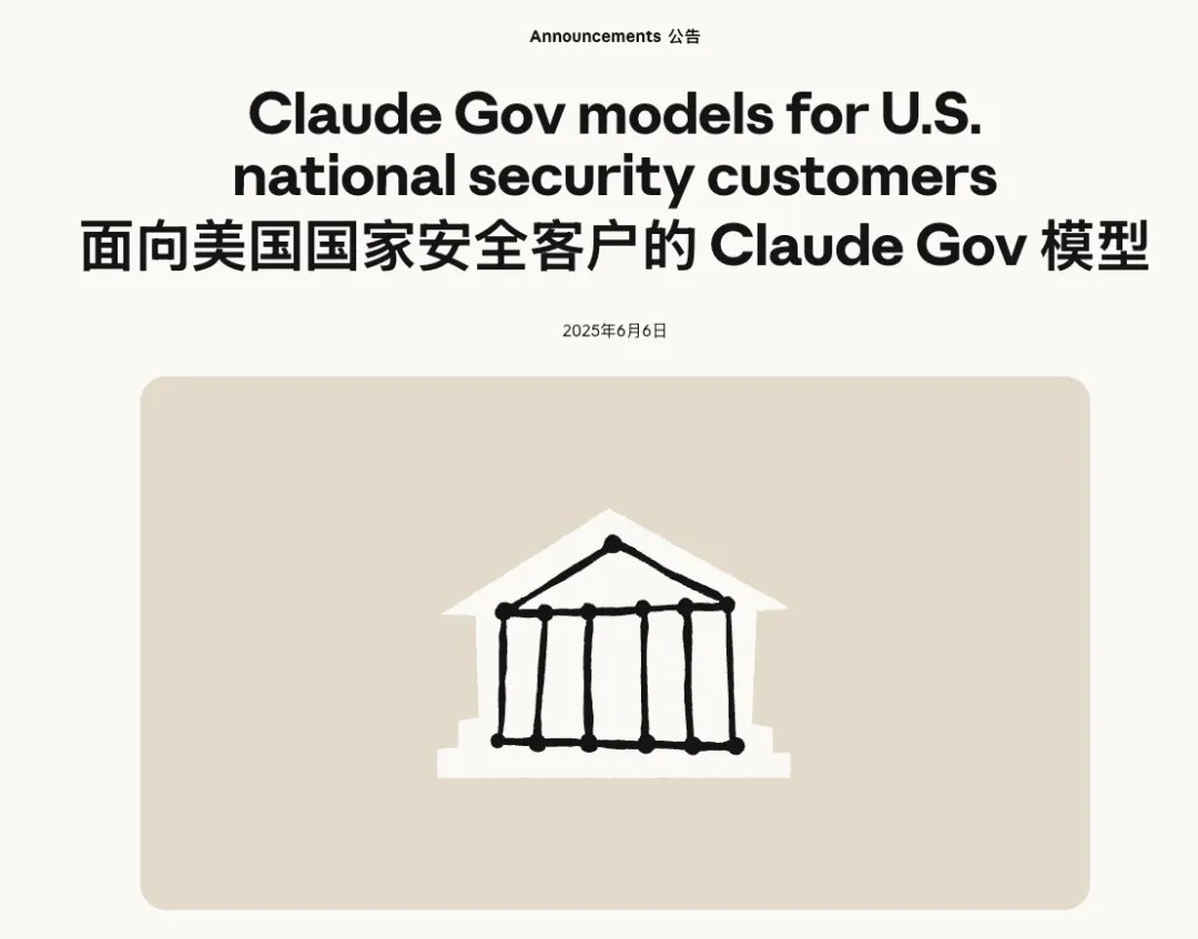 到了去年 6 月,Anthropic 更是直接写了篇博客,告诉大家他们给政府特调了一个模型,Claude Gov。