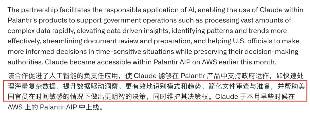 早在 24 年 11 月,Anthropic 和一家为美国军方提供大数据分析的公司 Palantir 就展开了合作,整上了个特殊的服务器,在里面运行上了政府定制版的 Claude。
