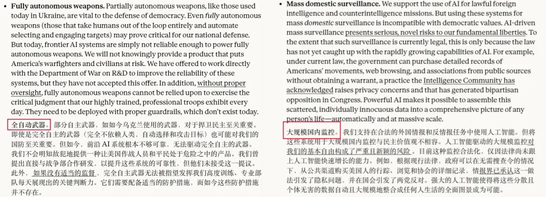 一是要求禁止军方把 AI拿去大规模的监控美国民众,二是不能拿 AI 来开发完全自主的杀戮武器。