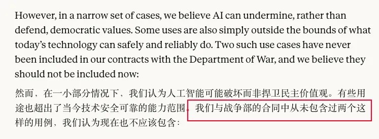 说完这俩话 Anthropic 还打了个补丁,说现在 AI 还没做到这些事,这俩红线只是放在未来以防万一的。