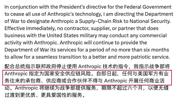 紧接着,美国国防部更是直接翻脸,将这家前脚还在帮他们处理机密情报的美国公司,正式定性为国家安全供应链风险,要求凡与美国军方有业务往来的承包商、供应商或合作伙伴,均不得与Anthropic开展任何商业活动。。。