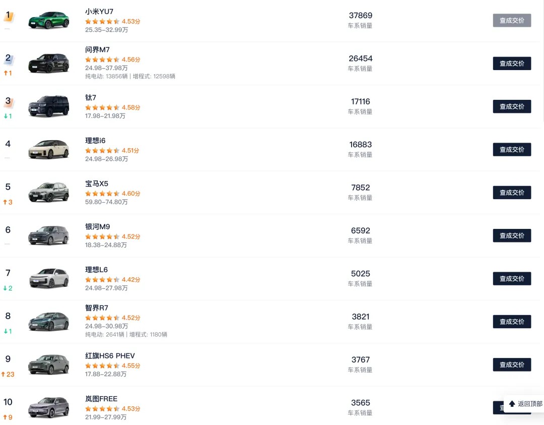 价格昂贵,意味着受众群体减少,小米发展壮大的前提,是能够从其他车企手中抢市场。理想、问界等车企走到今天,便是从合资车手中抢走了市场。统计数据显示,2026年1月国内中大型SUV销量前十中,仅有宝马X5一款合资车型,小米YU7位列第一,大型SUV销量排行前十五,没有一款合资车型,全部是国产车。