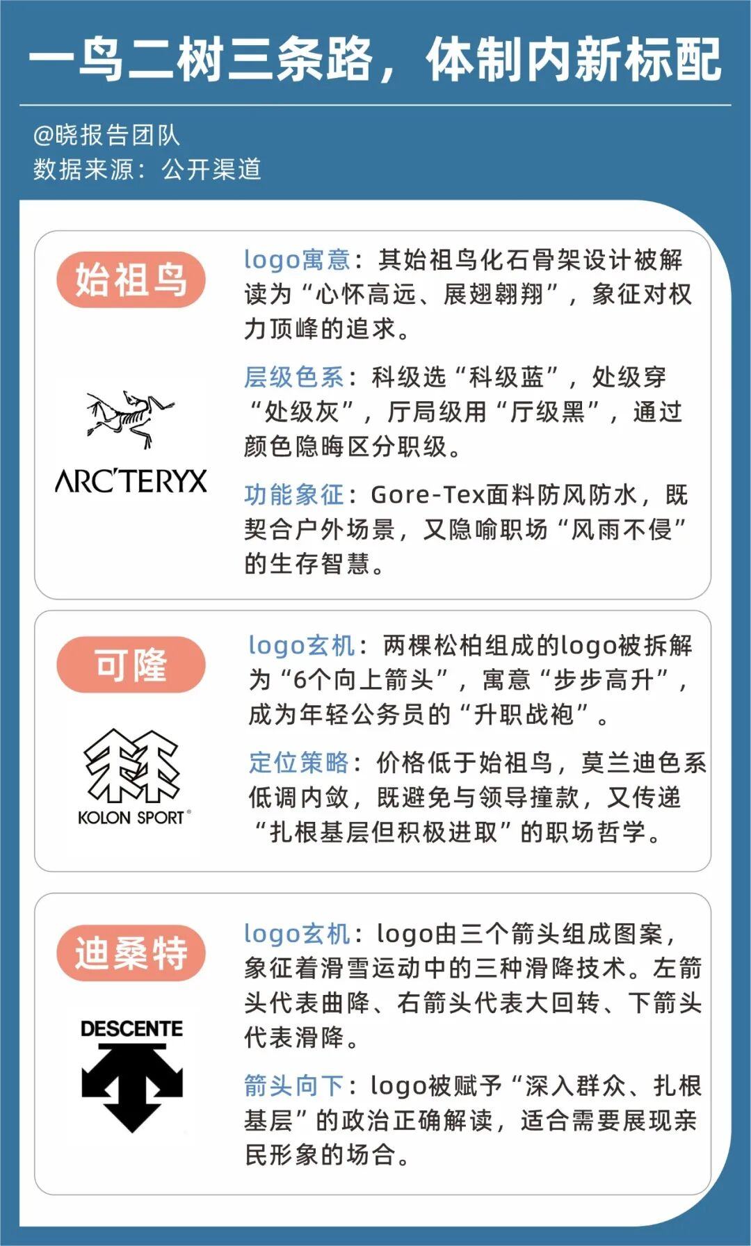 “二树”指可隆。这是韩国首个户外品牌,成立于1973年,在中国市场由安踏合资运营。可隆的logo神似六个向上的箭头,象征着“步步高升”,成为年轻公务员的“升职战袍”。