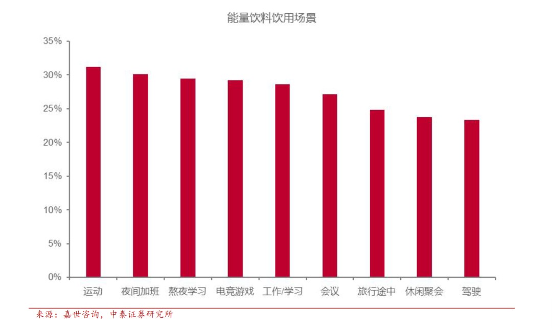 中泰证券研究发现,市场需求的变化,进一步带来消费场景分化。据《能量饮料2025市场简析报告》(嘉世咨询),能量饮料场景前三分别为运动、夜间加班、熬夜学习,分别占比31.21%、30.12%和29.44%。