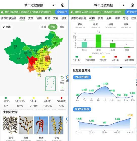 敏舒科技专注于过敏健康管理领域,以技术创新为核心驱动力,敏舒科技聚焦行业痛点,依托自主研发的“室内室外多源数据融合+AI智能预测”的核心技术,已搭建覆盖全球主要城市、涵盖花粉、真菌、尘螨、蟑螂、宠物毛发皮屑在内216种气传过敏原的高精度预报服务系统,实现低成本、广覆盖、实时更新的过敏原监测与预警。