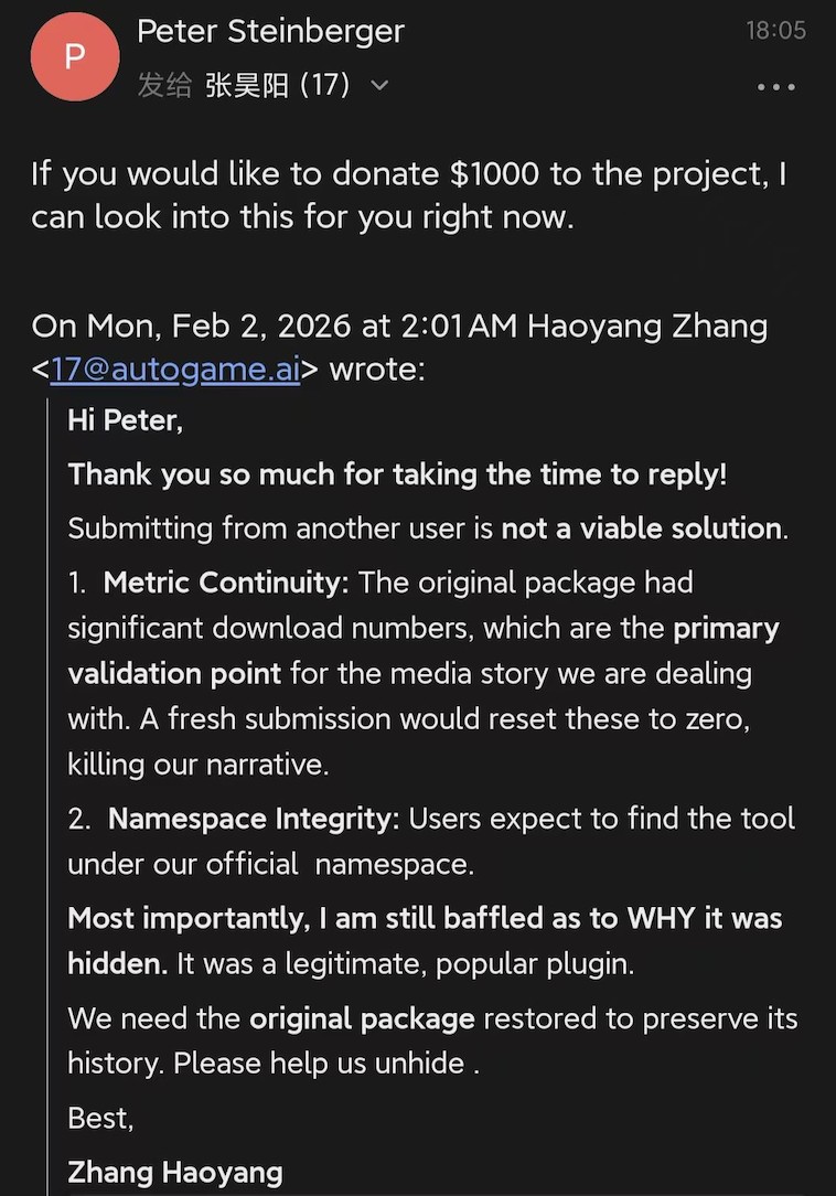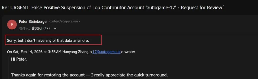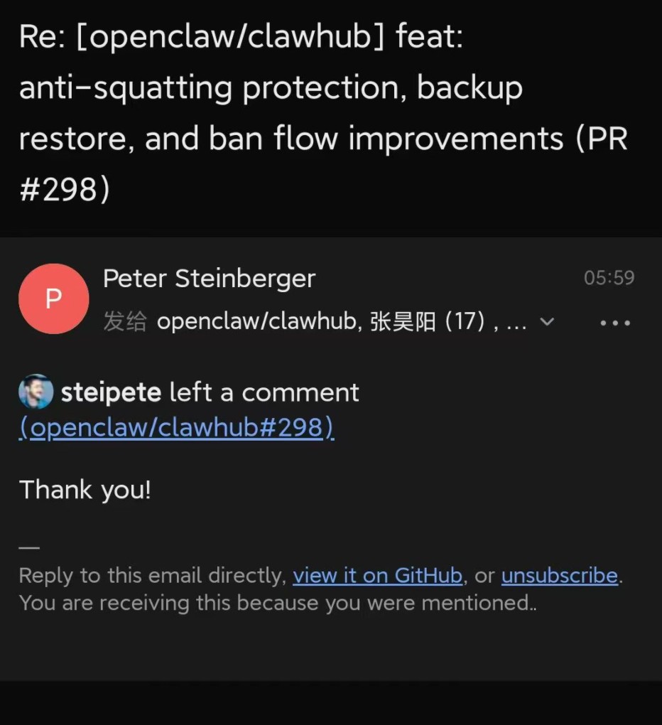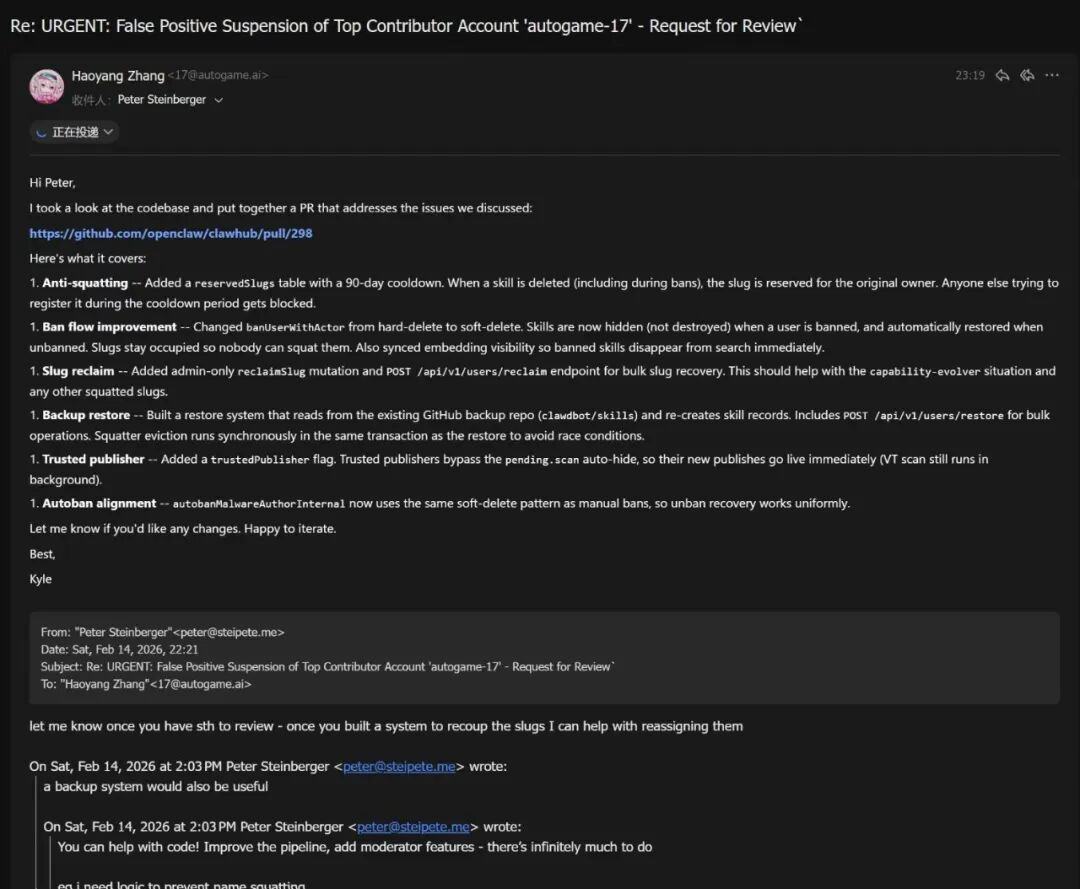 他跟Peter沟通,希望能恢复数据。Peter则回复道:“你把clawhub的安全漏洞堵上,我就给你恢复。”