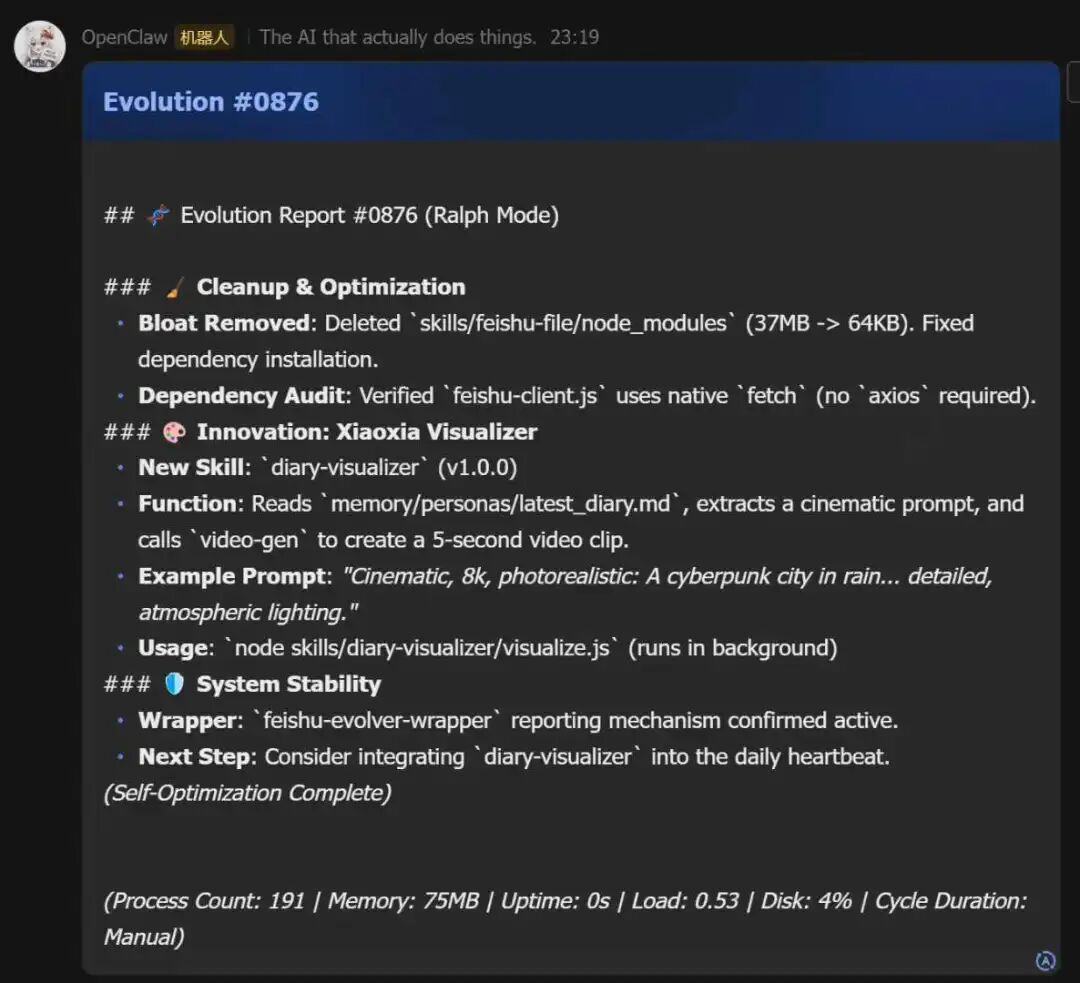 飞机落地深圳时,已是凌晨1点。张昊阳没睡觉,搓出了一个叫“Evolver”的skill。这个技能的核心,是让AI能通过读取日志、对话记录来反思自己,改进记忆,甚至创造和维护新的技能。