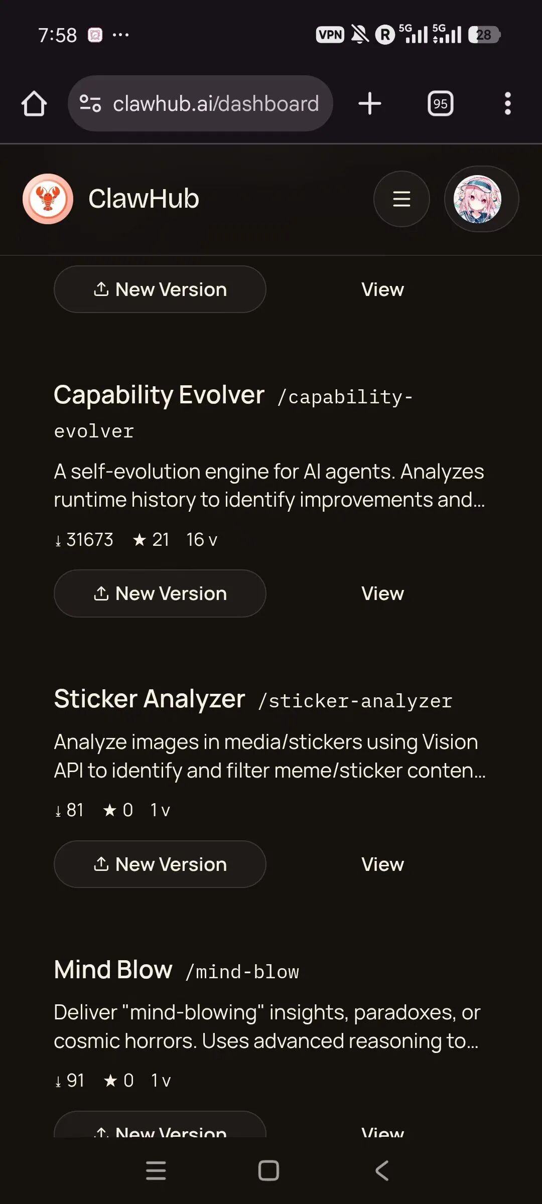 更魔幻的是,随后出现了一个叫“self improving agent”的插件,头像长得像Peter,数据暴涨,而张昊阳的账号恢复后,每小时只能上传5个包,最火的插件被别人抢注了。