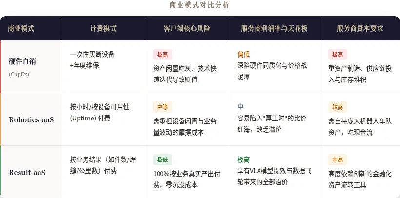 4.对一家谋求上市或高估值的具身智能公司而言,Robotics-aaS就像是固定利率收益,而Result-aaS则是充满爆发力的权益溢价。