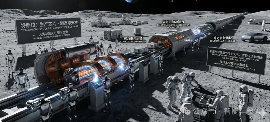 特斯拉则同时负责生产芯片和制造擎天柱机器人,后者会和人类携手在月球建一个电磁质量驱动器,用电磁力加速算力并将其发射到太空轨道。